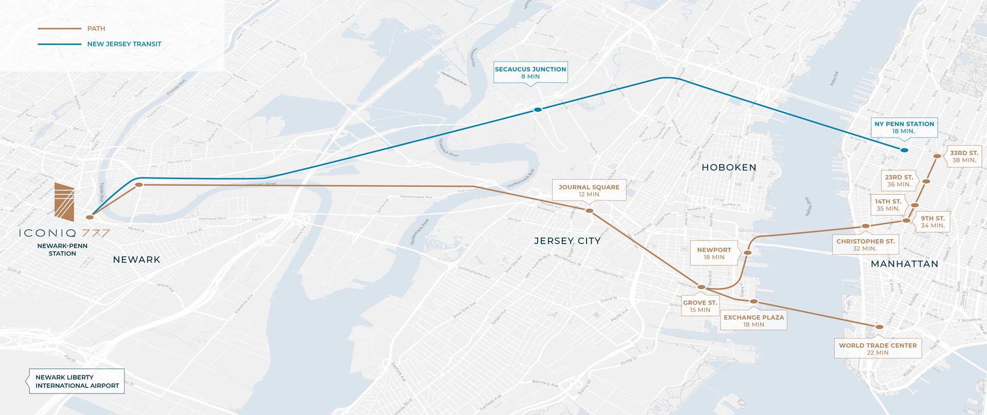 At Iconiq 777, experience next-level luxury living—34 levels to be exact—surrounded by spectacular living spaces, designer-approved interiors, world-class amenities, and jaw-dropping 360-degree views 400 feet up on our Sky Lounge. Live life exceptionally well with exclusive amenities, including upscale gourmet kitchens, a rejuvenating swimming pool and sun deck, an impressive rooftop terrace perfect for entertaining, convenient attached parking, an epic fitness center, and an undeniably hip location—mere steps from Penn Station and Prudential Center, the Ironbound District, and just 20 minutes to NYC by PATH/NJ Transit.